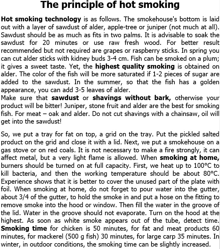 Hot smoked products are simply excellent, everyone who has ever tasted said they haven’t tried anything tastier. In addition, most importantly, this is home smoking, on the wood that you yourself put to the bottom, real smoking with your own hands. This idea will be the best for the passionate fisherman, experienced hunter and just a gourmet. Smokehouse does not take a lot of space in small trunk! This portable smokehouse is convenient for transportation and handling. Everything is very simple, and there will be plenty of good impressions!